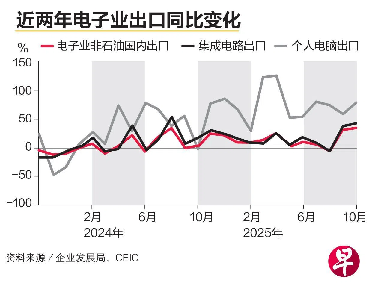 报告提到,持续的AI资本支出推高晶片、服务器及其他电子元件的需求,带动电子产品非石油出口(NODX)在9月和10月连续两个月增长逾30%。电子产品转口也在10月同比飙升51.8%,为批发贸易行业提供强劲支撑。