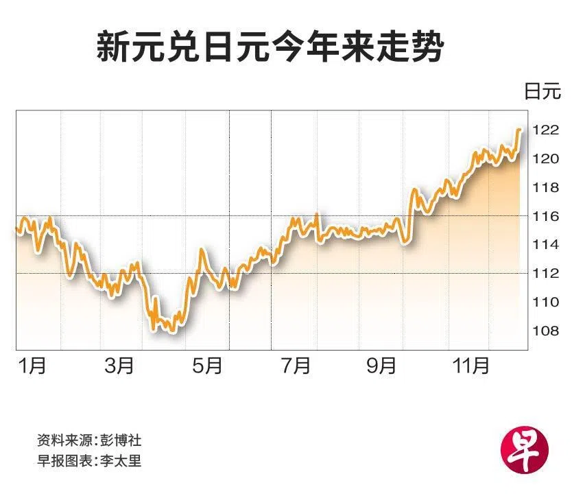 日本央行上星期五(12月19日)加息后仍保持一贯谨慎态度,被市场广泛视为缺乏“鹰派”信号,且加息早已被充分消化,日元汇率星期一(22日)早间继续下挫,其中新元兑日元汇率一度突破122,之后仍在121之上波动。