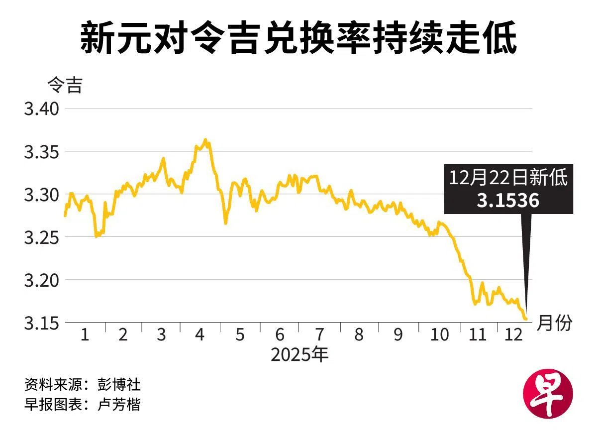 根据彭博数据,新元对令吉兑换率在星期一(12月22日)一度跌至3.1536,是2022年7月以来的新低。兑换率在星期一下午4时回升至3.1590。