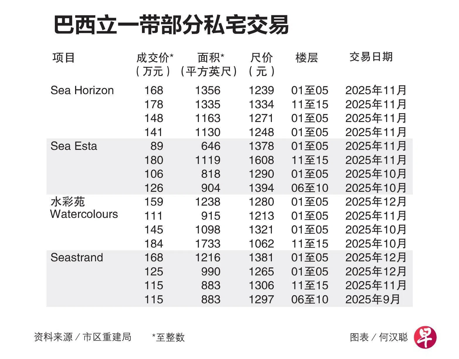 其中一个1335平方英尺的高层单位,以178万元易主,尺价达1334元,创11月最高。另一个面积相若的1356平方英尺低层单位,售价为168万元,尺价约1239元。Sea Horizon最高转售尺价曾在去年12月达1467元,一个1615平方英尺的中层单位以237万元成交。