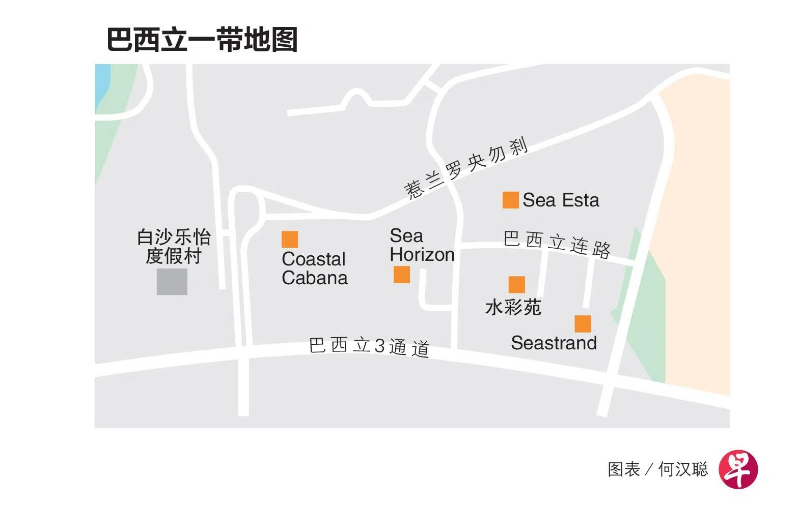 Coastal Cabana毗邻白沙乐怡度假村(Downtown East),不仅可便捷使用临海一带的休闲与康乐设施,周边的餐饮、购物等生活配套也一应俱全。美中不足的是,项目距离巴西立地铁站约1.5公里,步行前往需约17分钟。