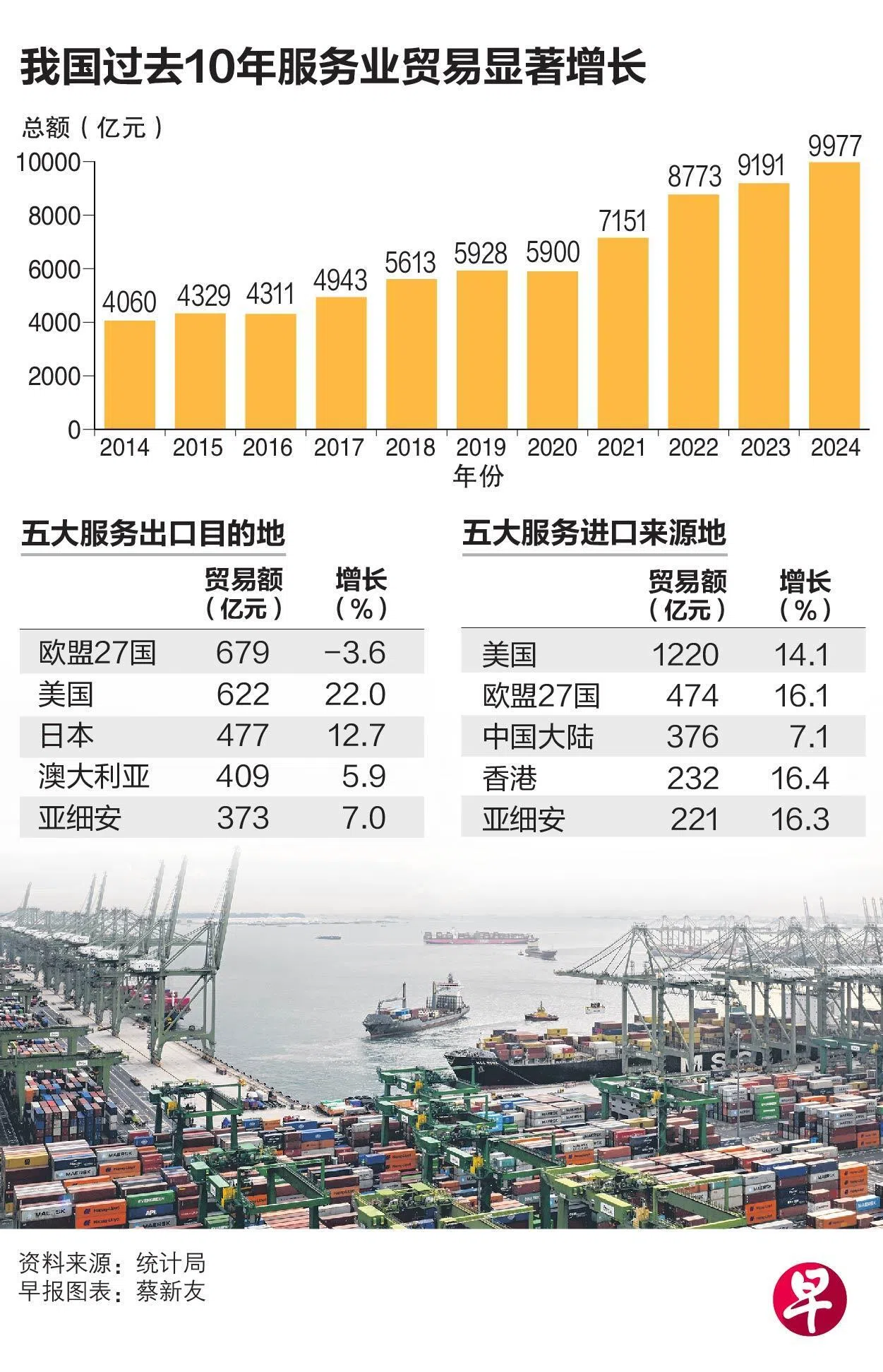 根据统计局发布的数据,2024年我国服务业贸易增长8.6%,服务出口和进口分别增长9.9%和7.1%,欧盟27国和美国分别是我国最大服务出口市场和进口来源地。