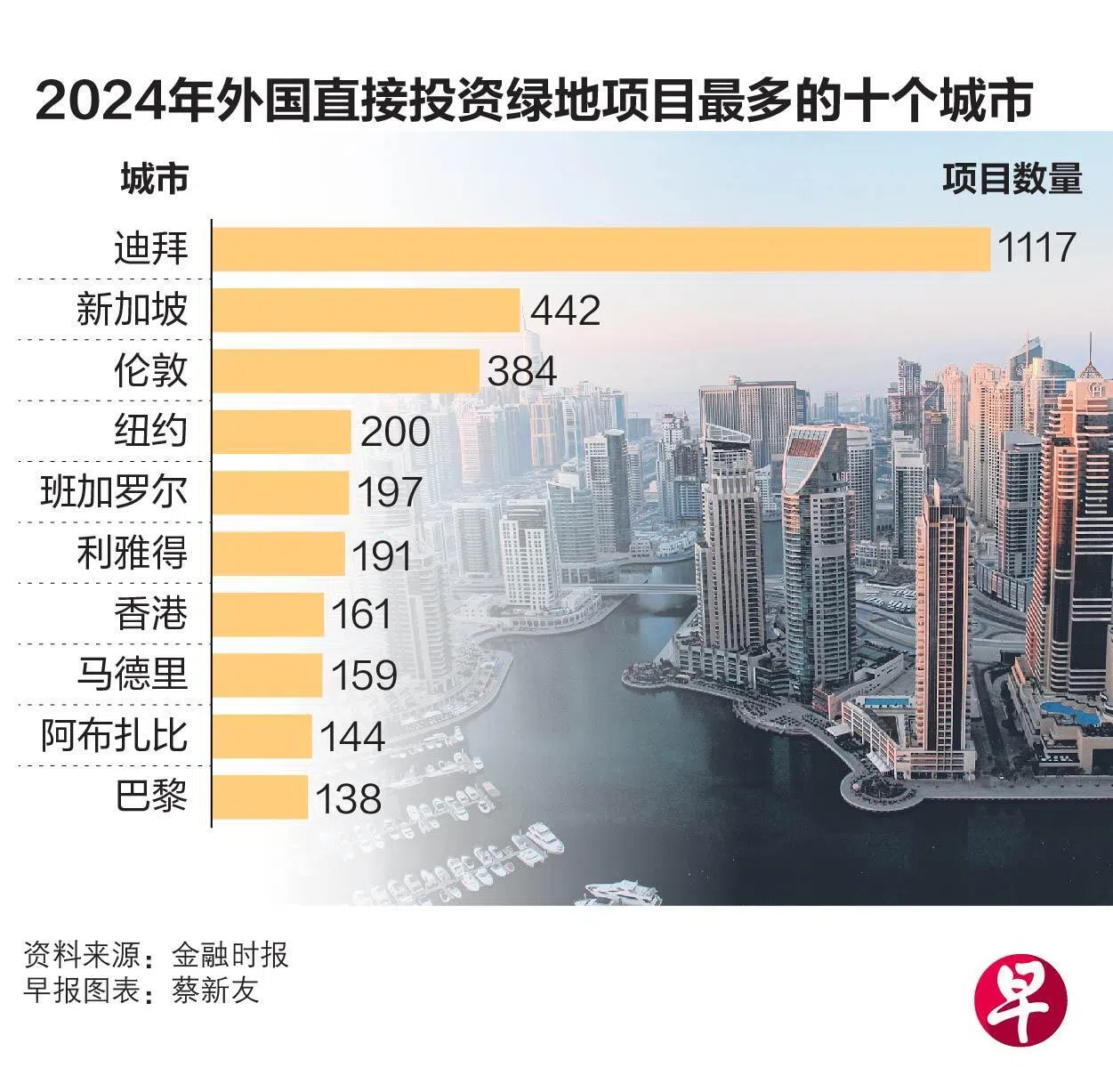 迪拜出口促进局今年11月发布的年报显示,2024年吸引全球绿地外国直接投资(Greenfield FDI,即从零建设新实体而非收购或入股)项目最多的城市是迪拜,有1117个项目;新加坡以442个项目排名第二。值得注意的是,前10名城市中有三个位于中东:迪拜、利雅得和阿布扎比。