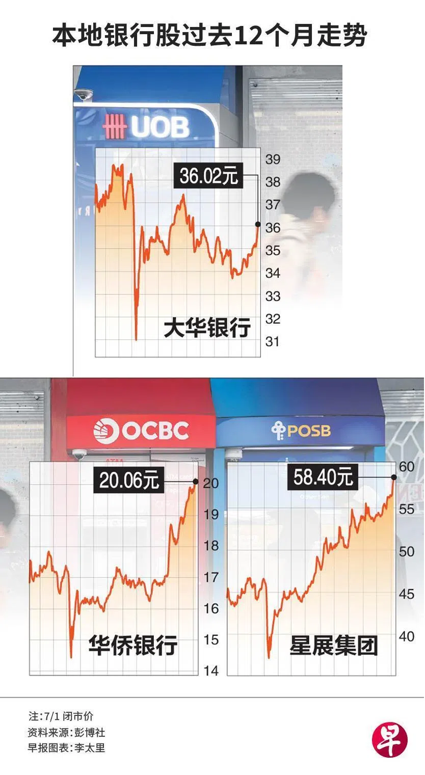 回看本地三大银行股过去12个月表现:星展集团大涨超过30%,华侨银行则起约19%。唯有去年第三季净利大跌72%的大华银行,同时期表现较逊色,微跌3%左右。