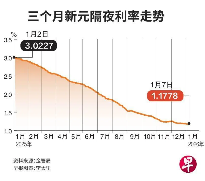 房贷参照的新加坡基准利率三个月新元隔夜利率,去年累计下跌超过180个基点,从2025年初的3.0227%降至今年1月7日的1.1778%。