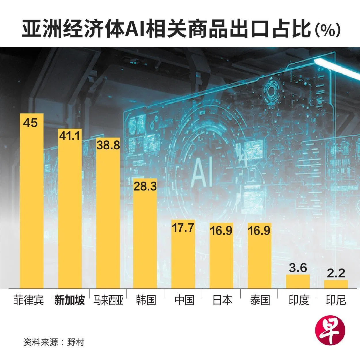 根据金融服务机构野村(Nomura)近期发布的报告,菲律宾的AI产品出口比率高达45%,新加坡和马来西亚紧随其后,AI产品出口比率分别为41.1%和38.8%。