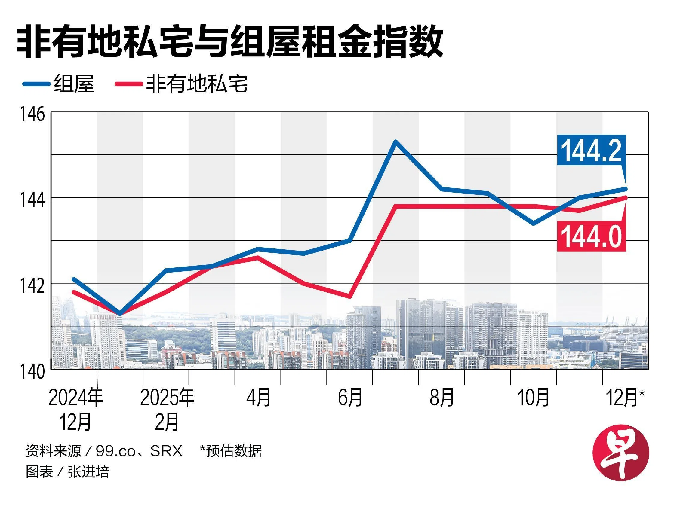 12月份整体租金环比上升0.1%,成熟住宅区租金环比增长0.4%,非成熟住宅区租金则持平。四房式、五房式和公寓式组屋租金涨幅介于0.1%至1.4%;三房式单位租金跌0.2%。