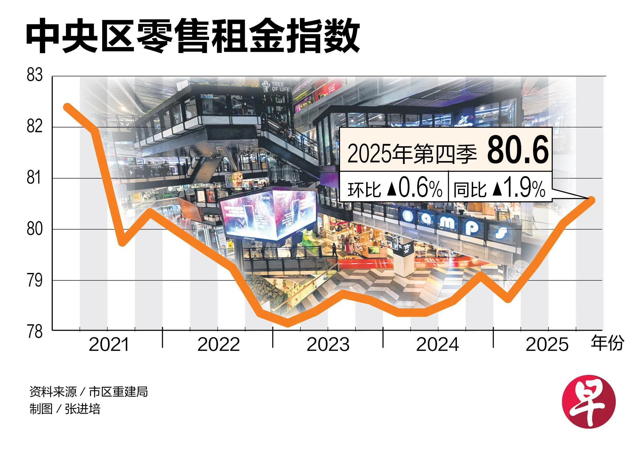 新加坡中央区零售租金在去年第四季环比增长0.6%,低于前一季的0.9%,增幅有所放缓。不过,全年零售租金上升1.9%,高于2024年的0.5%。