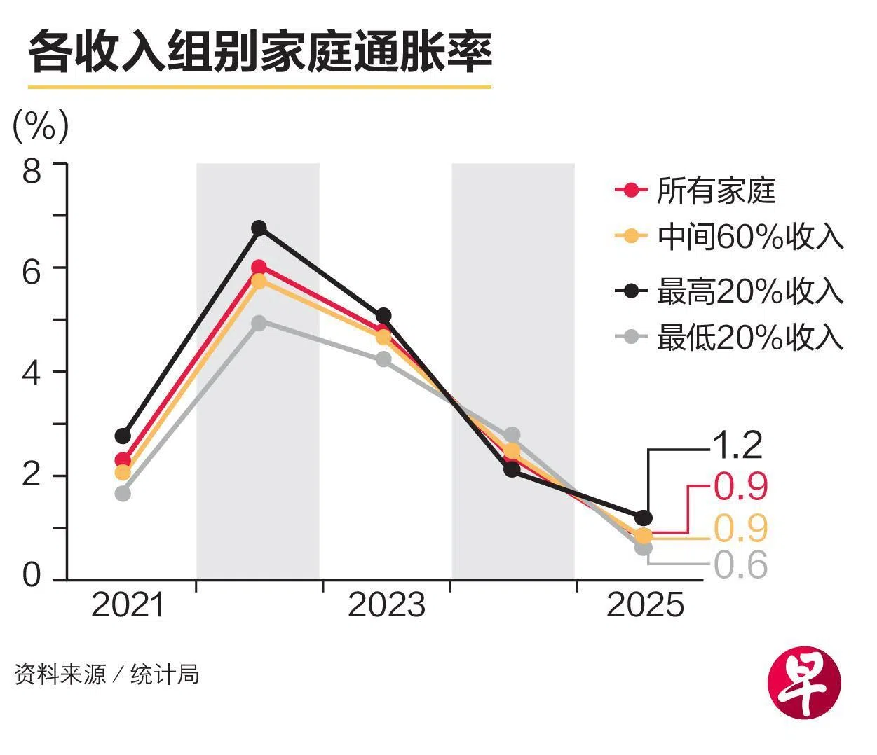 统计局说,从2025年全年来看,对所有三个收入组别的通胀率增长影响最大的支出,包括医疗保险、食品、住宿、汽车、公共交通,以及水费。