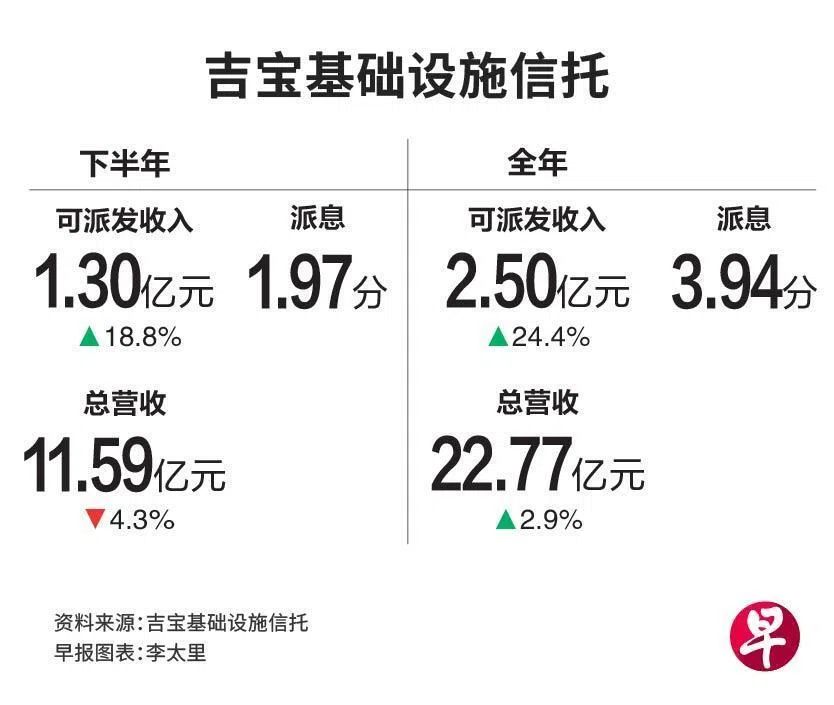 吉宝基础设施信托(Keppel Infrastructure Trust)截至2025年12月31日的下半年每单位派息(DPU)为1.97分,同比增长1%。全年每单位派息3.94分,较去年同期的3.90分来得高。