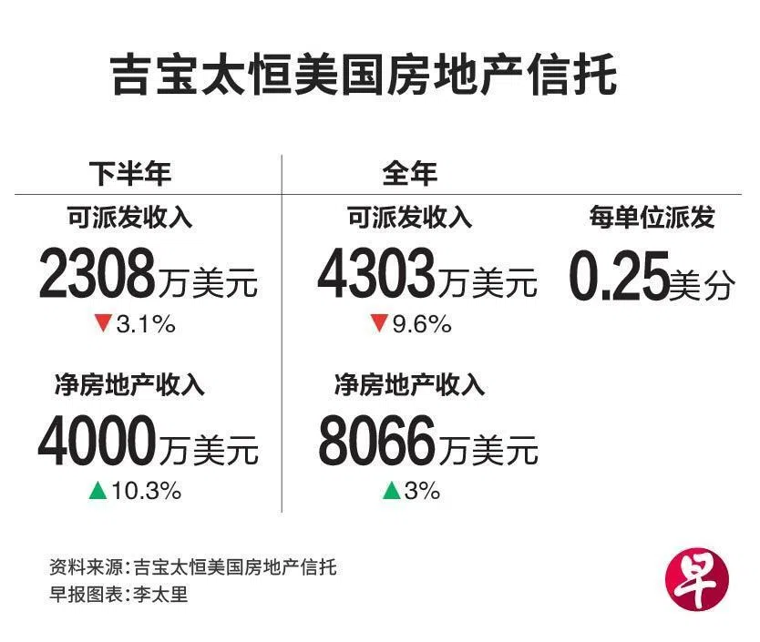 信托全年的总收入同比增长2.5%,达1亿5020万美元。经调整后的净房地产收入增长0.3%至8370万美元,主要受其他营运收入、费用回收及房地产税减免带动,但部分被更高空置期带来的租金减少所抵销。