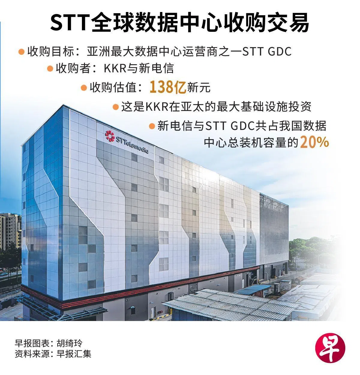 美国私募投资公司KKR与新电信(Singtel)组成的财团,将以66亿元收购新科电信媒体全球数据中心公司(ST Telemedia Global Data Centres,简称STT GDC)其余82%股权。有市场分析,这使新电信以较低的成本,获取较长期的增长动力。