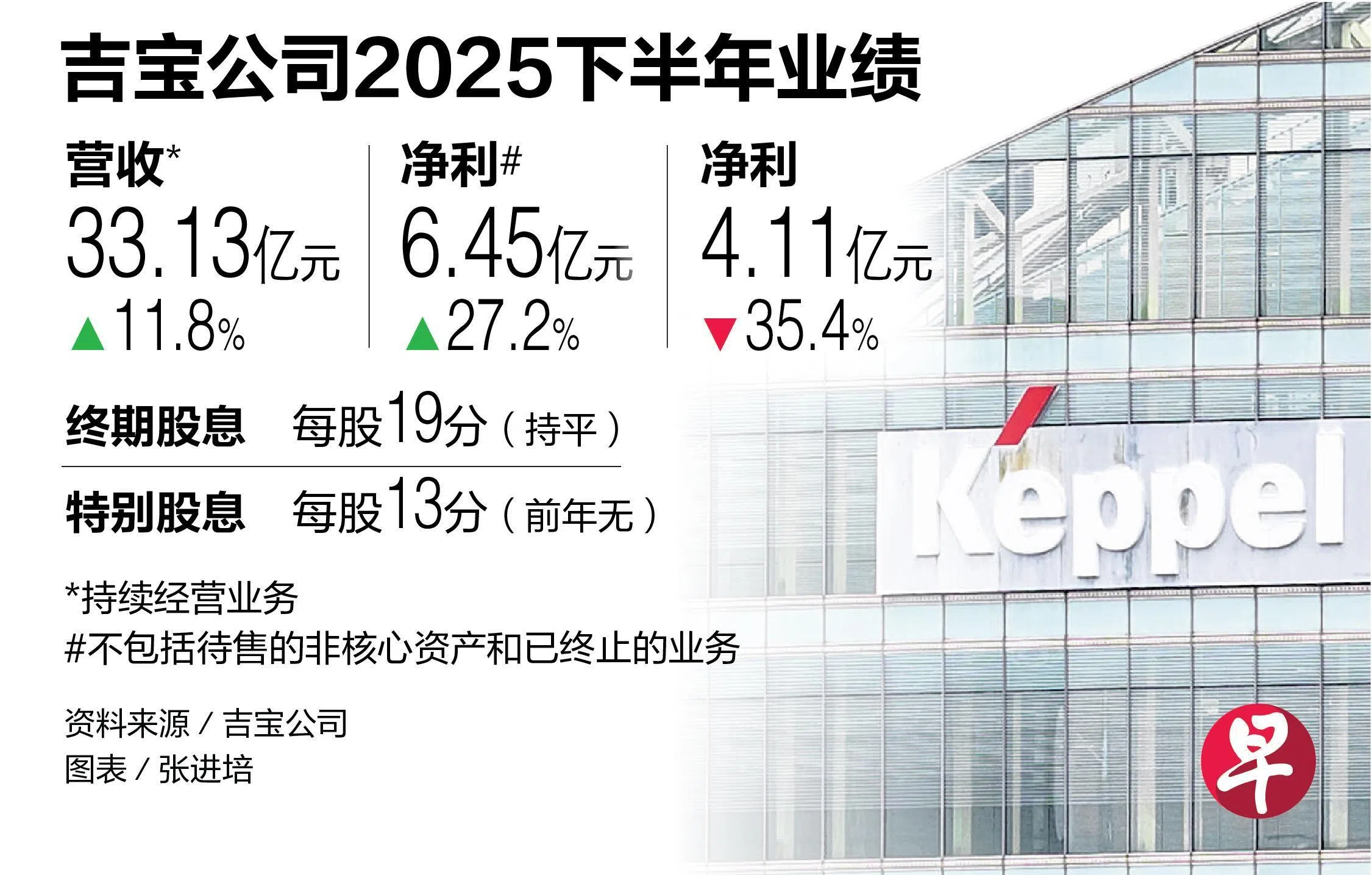 吉宝有限公司(Keppel Ltd)2025财年下半年净利同比下跌35.4%至4亿1080万元,但持续经营业务的下半年净利同比增加27.2%,达到6亿4540万元。