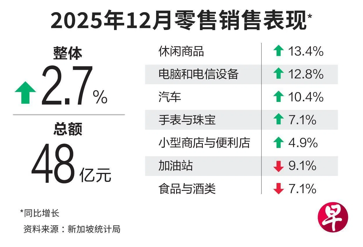 展望未来,蔡汉廷认为,本地零售销售将继续受就业市场韧性、1月发放的邻里购物券,以及农历新年相关需求的支撑,不过第一季通常波动较大。