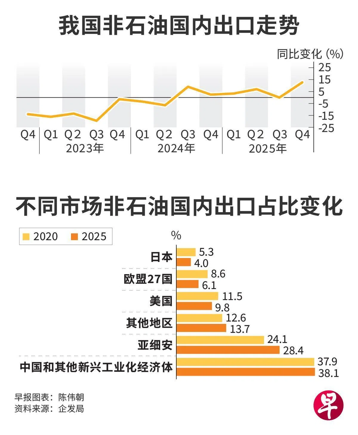 主要市场方面,我国在2025年对台湾、韩国和欧盟27国的非石油国内出口增幅显著,分别增长37.4%、21.7%和12.2%。