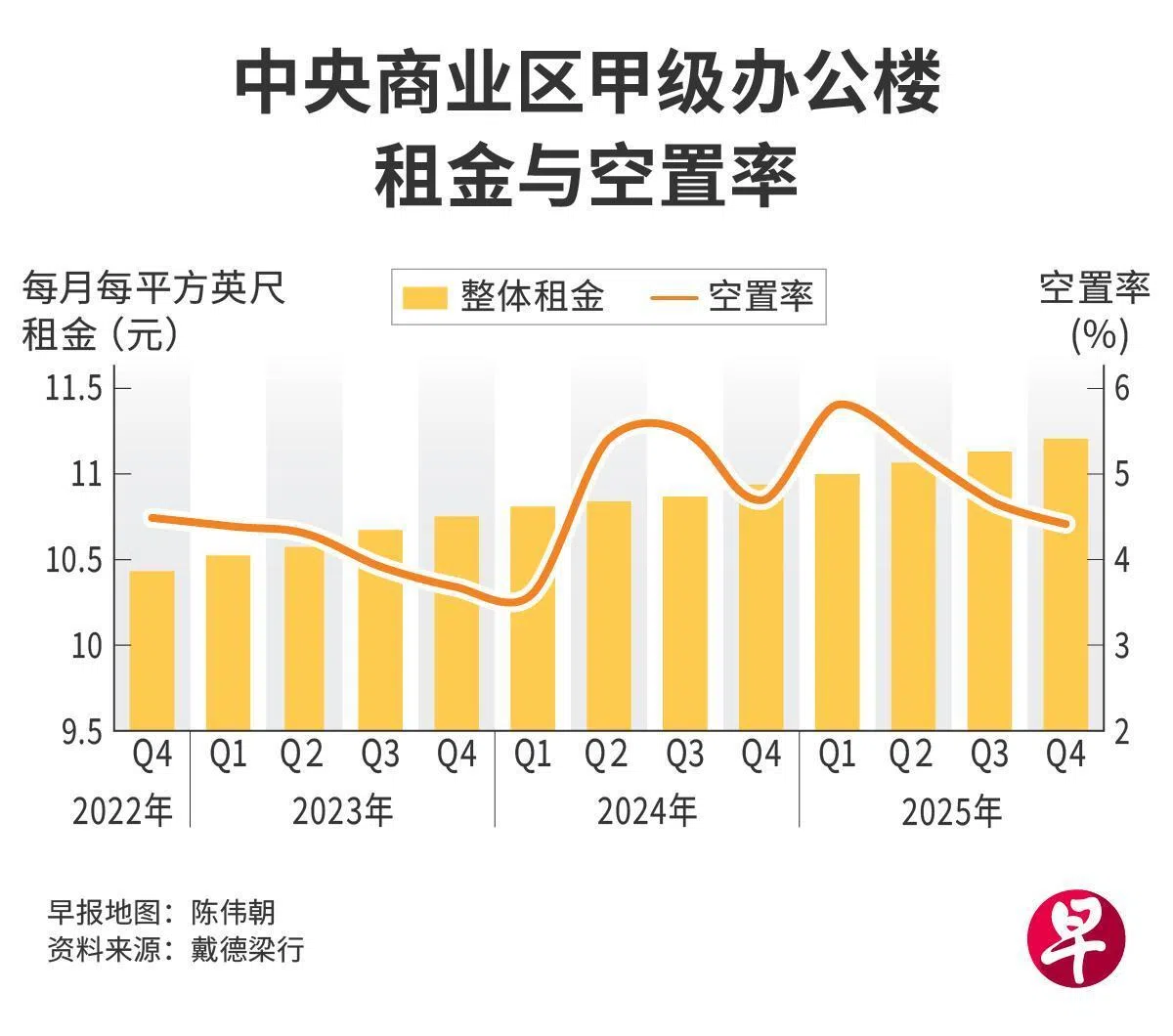戴德梁行(Cushman & Wakefield)新加坡及东南亚研究部主管黄显洋指出,在中央区内,核心中央区在2025年仍占据净需求的主要部分,达40万平方英尺,凸显租户对核心中央商业区位置的持续偏好,致使空置率连续三个季度下跌,在去年末季达9.6%。