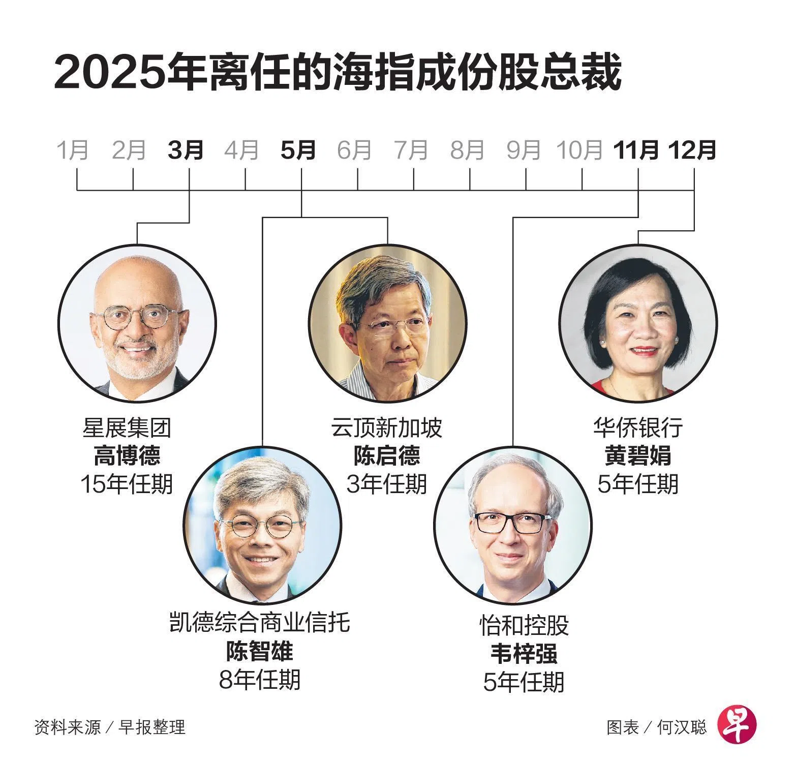 根据《联合早报》整理,去年离任的海指成份股公司总裁,包括星展集团的高博德(Piyush Gupta)、凯德综合商业信托的陈智雄、云顶新加坡的陈启德、怡和控股的韦梓强(John Witt),以及华侨银行的黄碧娟。其中,高博德的任期最长,达15年。