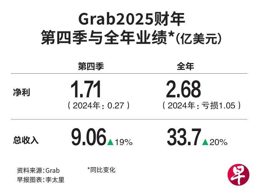 在美国纳斯达克上市的Grab星期四(2月12日)公布的第四季及全年业绩显示,公司全年净利达2亿6800万美元(约3亿3830万新元),大幅扭转2024年的1亿5800万美元亏损;全年营收增长20%至33亿7000万美元。