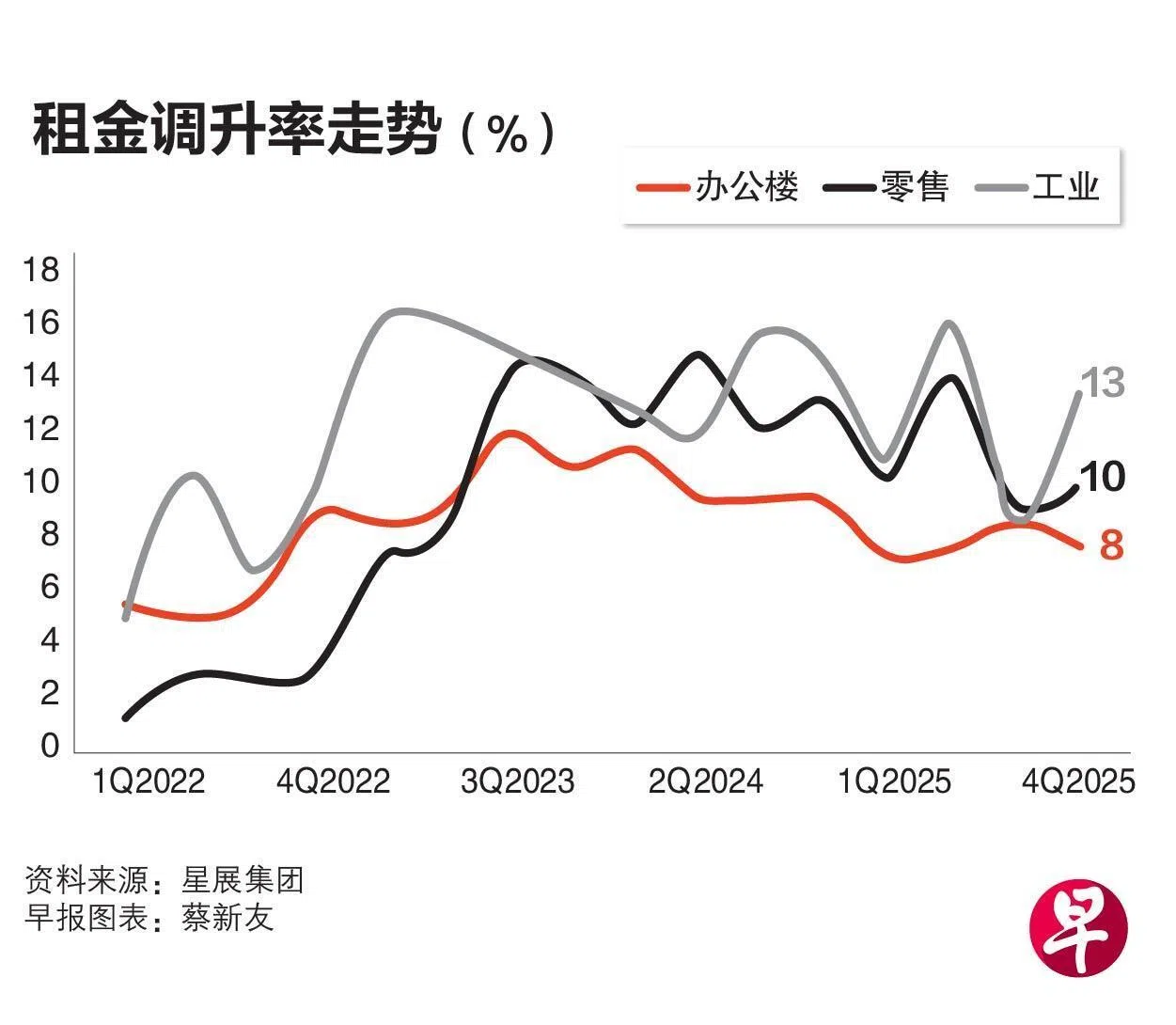 根据星展研究,办公楼、零售和工业房地产信托在2025财年的租金调升率均取得增长,分别上升8%、10%和13%。