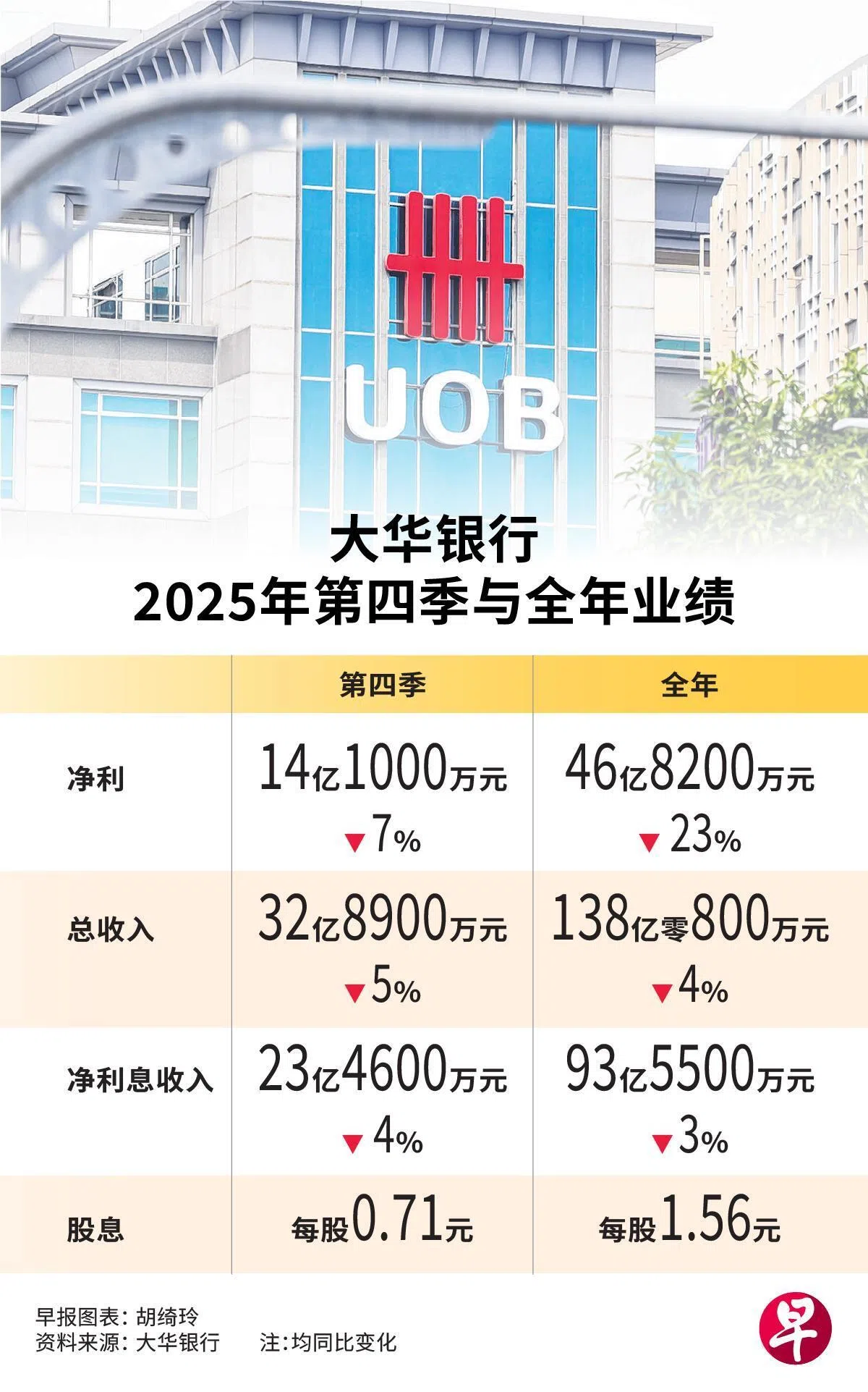 基准利率走低带来利润压力,大华银行去年第四季净利同比下滑7%,至14亿1000万元,低于市场预期。全年净利同比下滑23%,至46亿8200元。