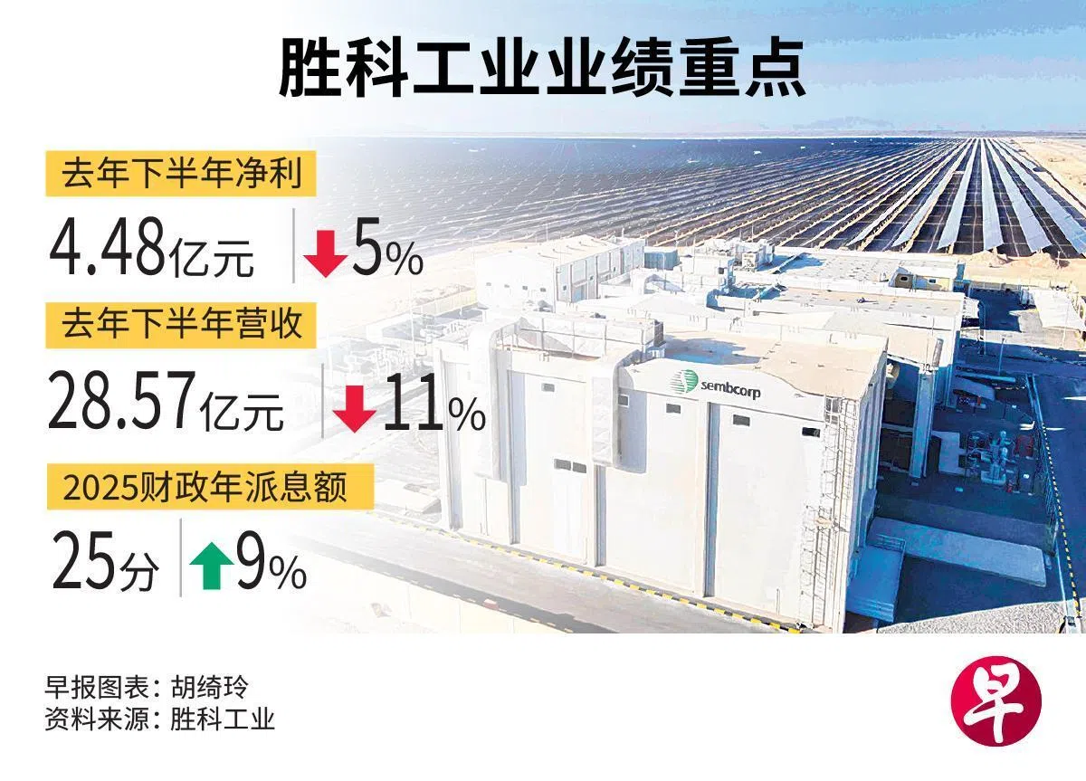 由于营收有所下滑,胜科工业(Sembcorp)去年下半年净利同比萎缩5%至4亿4800万元。公司建议派发每股16分的终期股息,连同去年8月已派发的9分中期股息,2025财政年的全年股息总额达到25分,较上一年高9%。