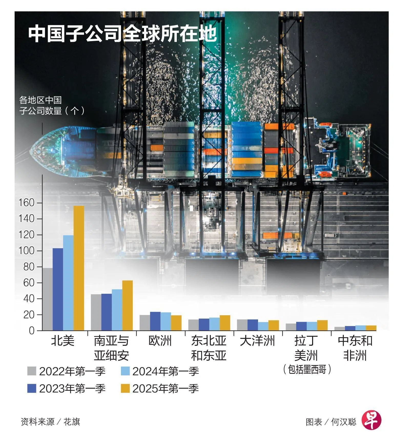 报告指出,从2022年第一季至2025年第一季期间,中国公司在北美、南亚及亚细安地区的活跃子公司显著增加,位于墨西哥的中国子公司数量达2022年的三倍。
