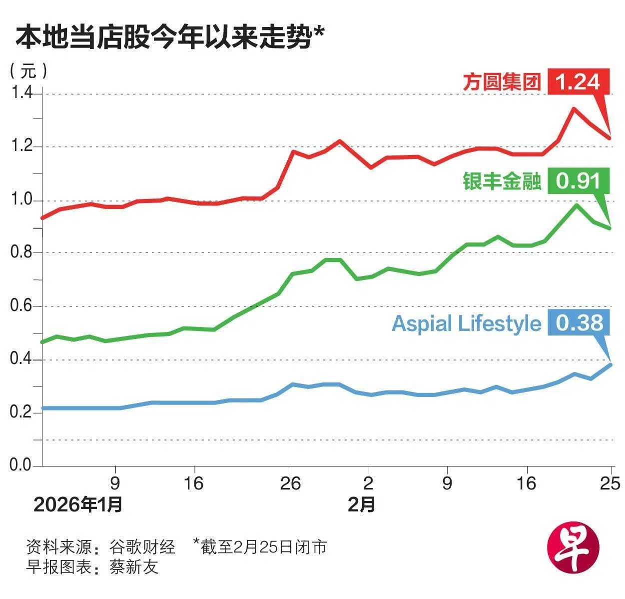 Aspial Lifestyle股价星期三闭市报0.38元,上涨15.15%。公司股价今年以来已经涨72.73%。银丰金融和方圆集团今年以来,也分别涨了99.62%和31.91%。