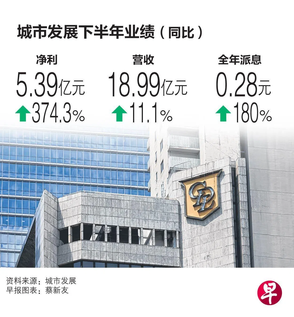 本地房地产市场热火朝天,带动发展商城市发展旗下的私宅销量。公司去年下半年净利同比大增374.3%,至5亿3851万元;营收增加11.1%,至18亿9920万元。