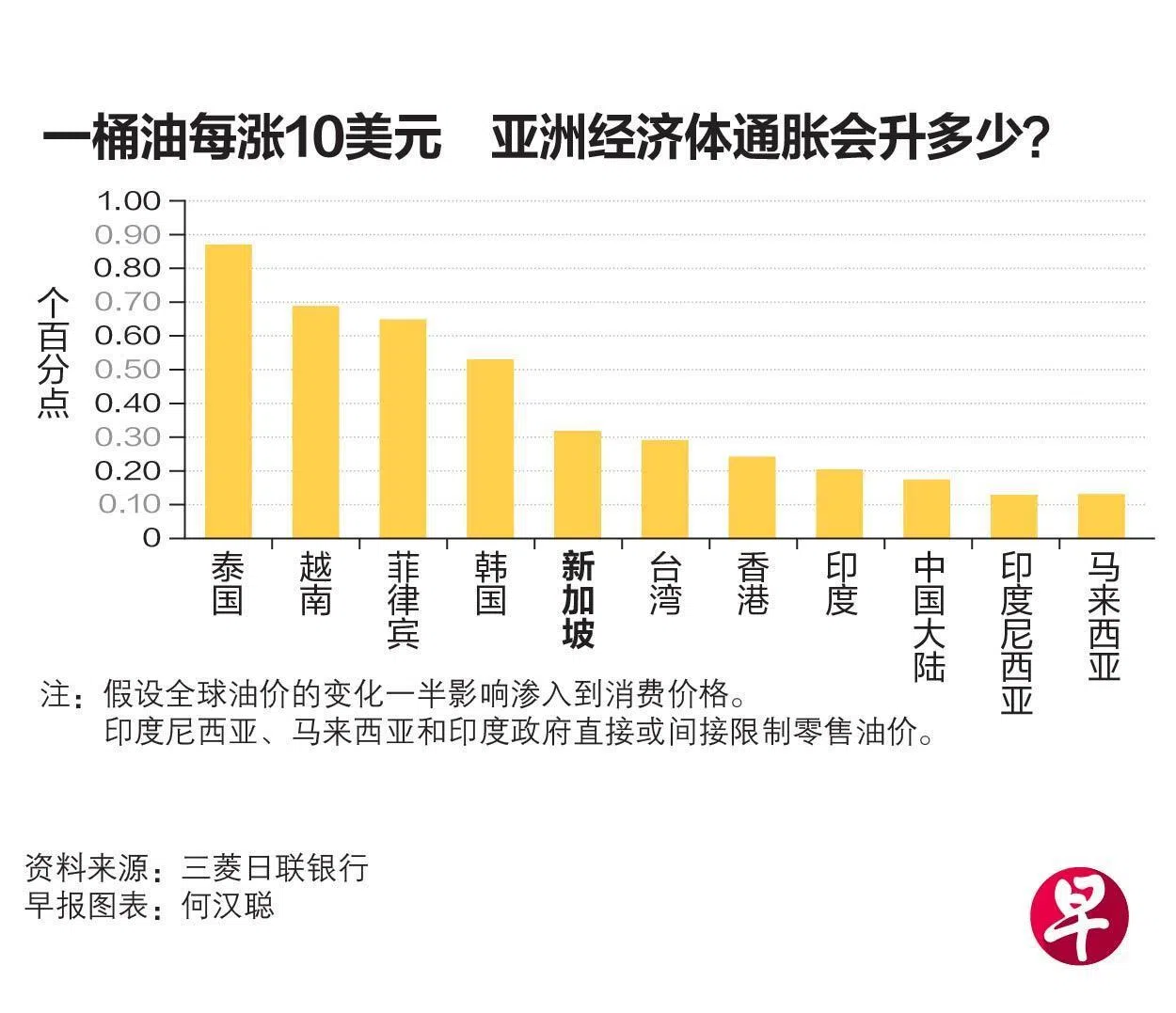 三菱日联银行(MUFG Bank)资深货币分析师温镇全预计,油价每上涨10美元,新加坡的整体通胀率就会上升超过0.3个百分点。