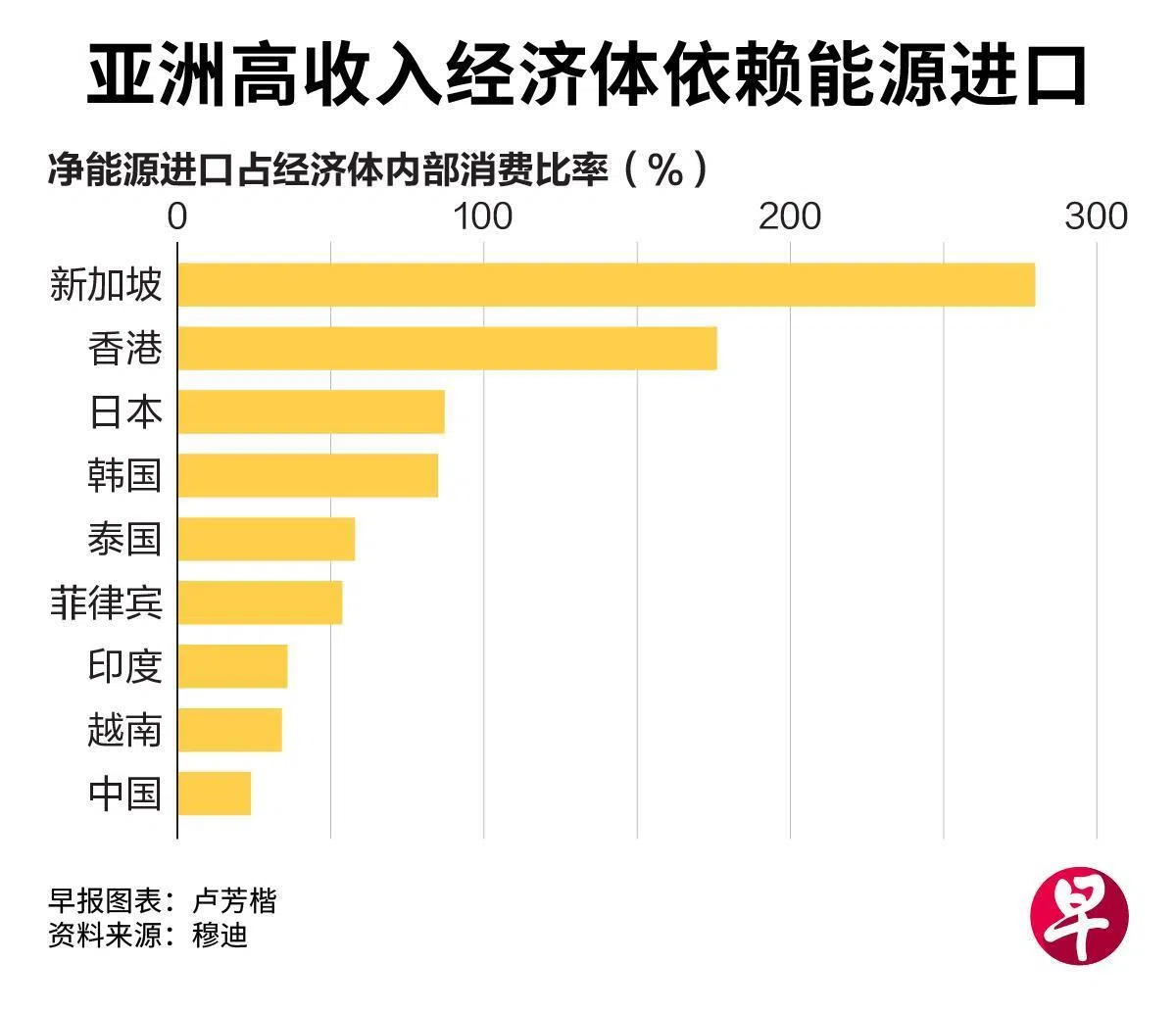 穆迪分析(Moody’s Analytics)在报告中指出,亚洲的高收入经济体高度依赖大宗商品进口,更容易受到直接经济冲击。日本、韩国、台湾、新加坡和香港所消耗的能源,超过80%来自于进口。新加坡净进口的能源,和国内消耗的比率超过250%。
