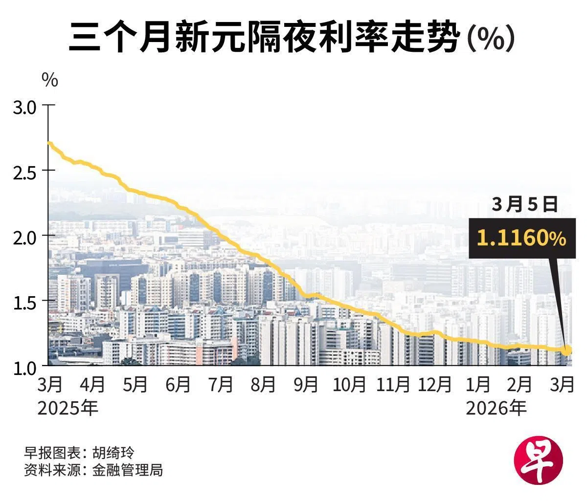 本地房贷参照的基准利率,即三个月新元隔夜利率(SORA)持续走低。金融管理局星期五(3月6日)发布的数据显示,该利率降至1.1160%,为2022年7月以来最低。自2025年初以来,三个月SORA已累计下滑超过190个基点。