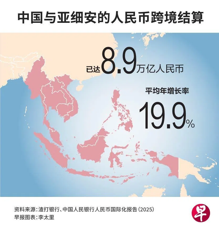 根据中国人民银行人民币国际化报告(2025),中国和亚细安的人民币跨境结算在2024年劲增50.7%至8.9万亿人民币,五年平均年增长率19.9%。