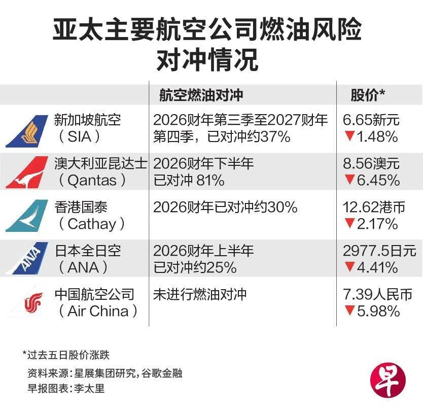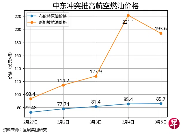 燃油是航空公司仅次于人力的第二大成本,通常占运营成本的约20%至25%。随着冲突升级,上星期三(4日)新加坡航空燃油价格一度飙升至每桶221美元,比一星期前上涨140%。