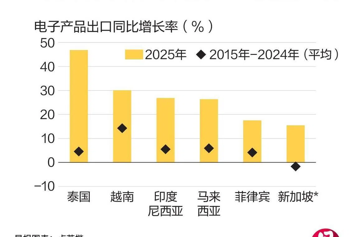 她在报告中说:“在许多方面,这应该会彻底改变亚洲,尤其是亚细安的贸易格局。事实上,2025年已经印证了这一点:亚细安各国的电子产品出口同比增长率在15%至47%之间,远超各自过去十年的平均水平。”
