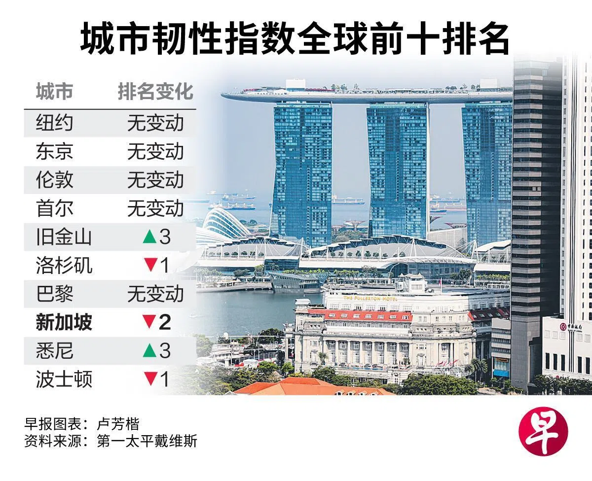 新加坡移民人口流入增速放缓,导致它在全球最具韧性城市中排名下滑。不过面对战争和贸易政策不确定因素,新加坡“避风港”的优势可助它排名回升。