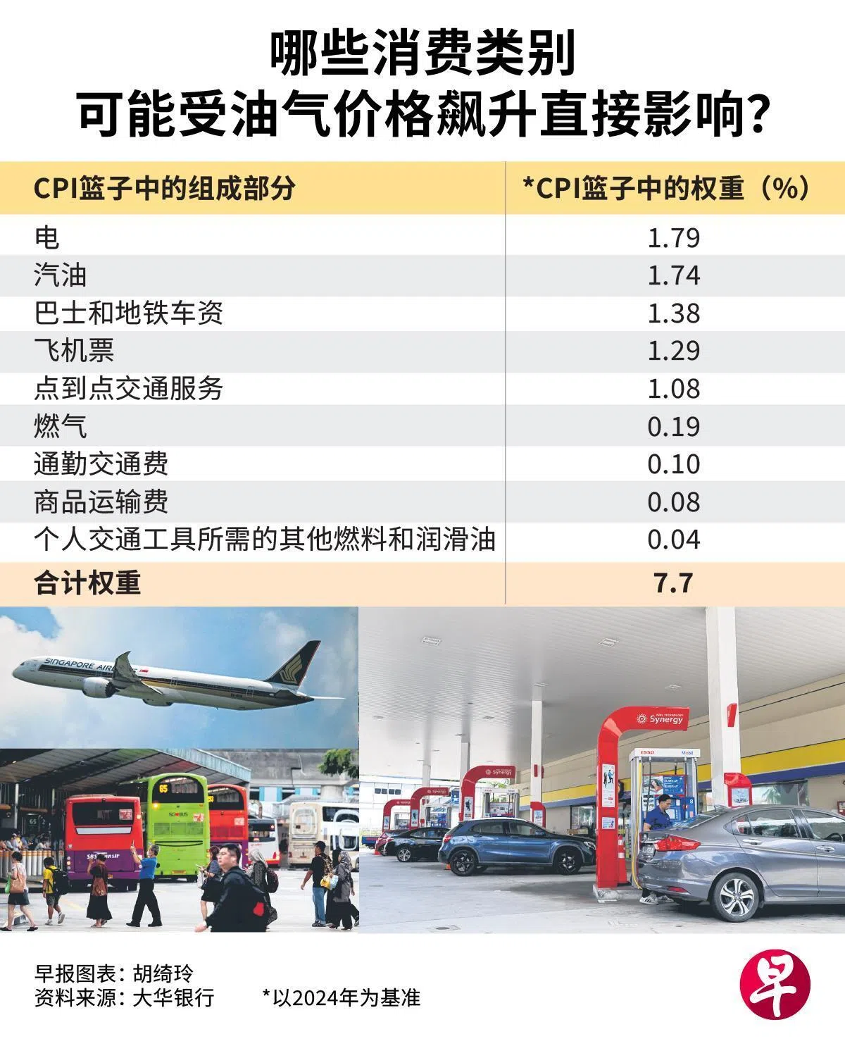 大华银行经济师许俊杰说,新加坡整体CPI篮子中,约有7%至8%的项目可能直接受油气价格波动影响,包括机票、公交费、汽油、电费和燃气费等。