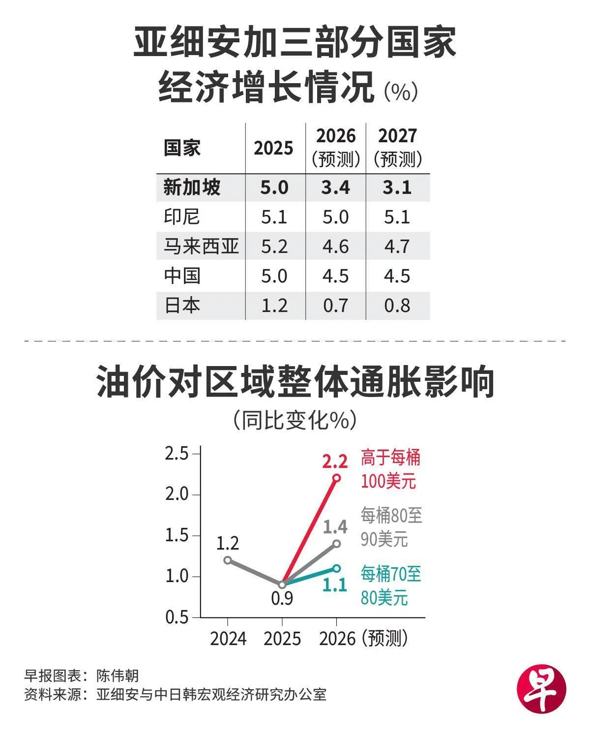 尽管中东局势不稳,导致全球能源供应受扰、经济下行风险上升,但亚细安与中日韩三国的经济仍处于相对有利位置。预计这个区域经济,在2026年与2027年将各增长4%。