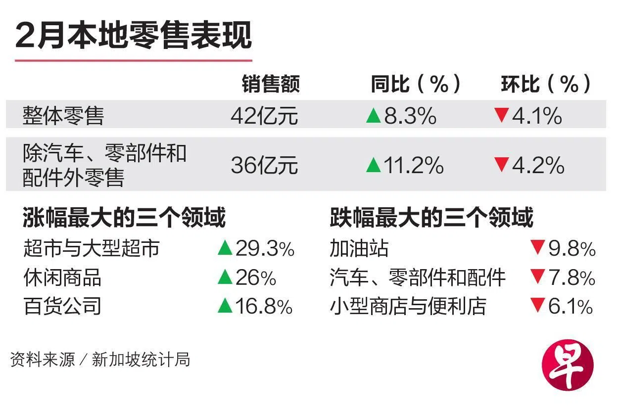 新加坡统计局星期一(4月6日)发布的最新零售销售数据显示,若不包括汽车、零部件和配件销售,2月份的零售销售额同比增长11.2%,表现也比1月份的下跌2.9%明显改善。