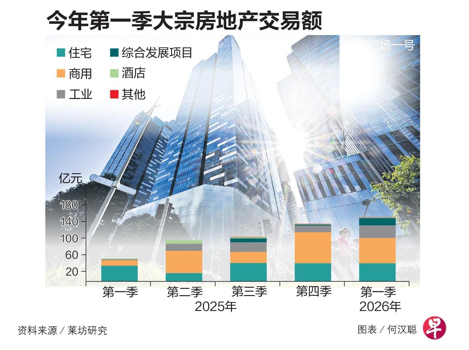 受低利率推动,新加坡今年第一季的大宗房地产交易额同比大涨166.5%,达到154亿元,创下有记录以来的新高。