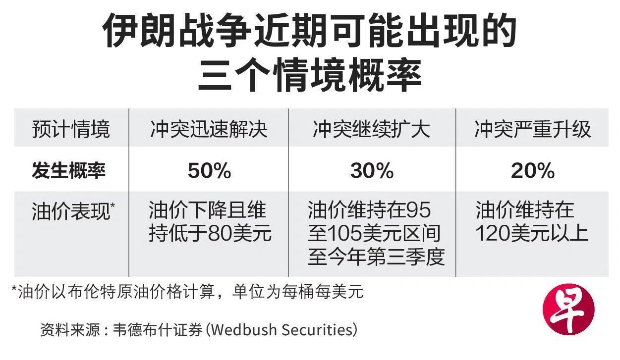 根据韦德布什证券的预测,在第二种情境下,布伦特原油价格将维持在每桶95美元(约121新元)至105美元的相对高位,直至2026年第三季度。如果事态继续恶化到第三种情境,美军发动地面战且霍尔木兹海峡再度关闭,油价将飙升至每桶120美元以上,最终或导致经济衰退。