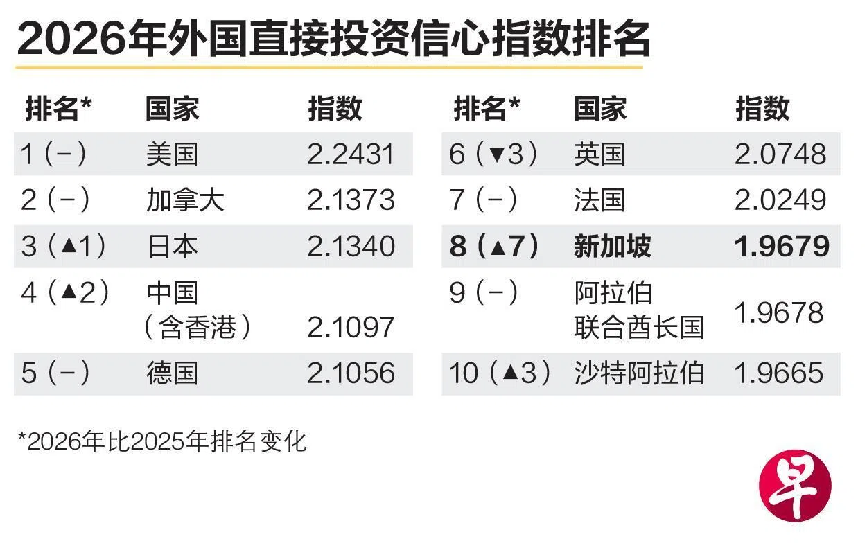 新加坡在全球外国直接投资信心榜单中,从去年的第15名跃升至第八名,是14年来最高排名。这也使我国在此前连续两年退步后,今年成为进步最显著的市场。