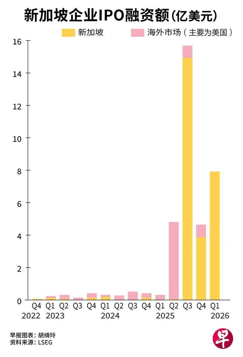 根据市场分析公司LSEG提供给《联合早报》的数据,今年第一季共有三家新加坡注册的公司在新加坡交易所上市,共融资近8亿美元,而同期没有企业赴美国上市。