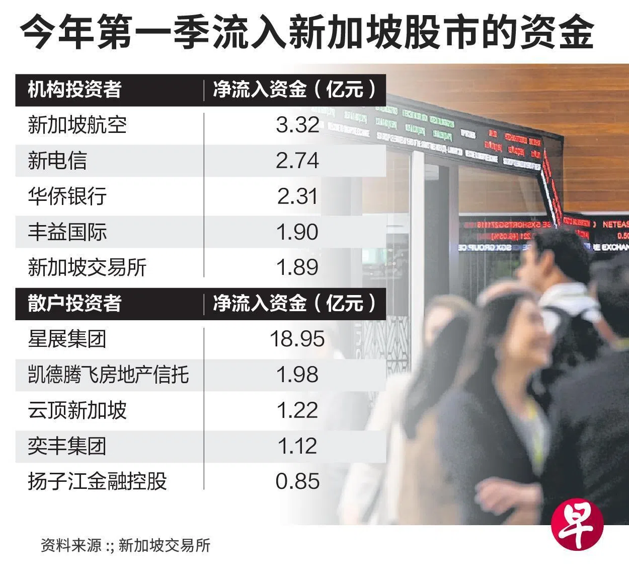 新加坡股市今年第一季的“吸金力”强劲,散户投资者积极购入机构投资者脱售的股票,其中星展集团(DBS)最受青睐。