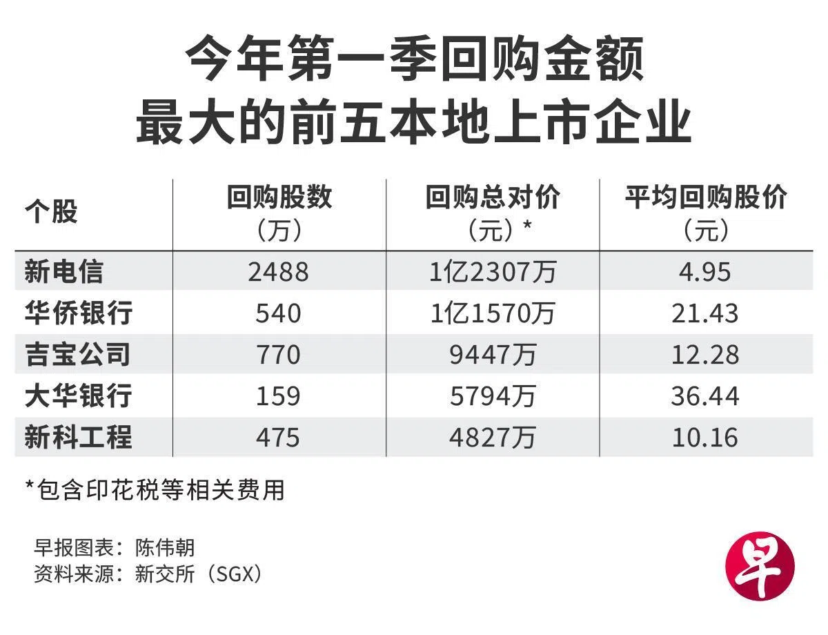 根据新加坡交易所(SGX)最近发布的数据,今年第一季回购总额最高的前三家企业分别为新电信(Singtel)、华侨银行(OCBC)和吉宝公司(Keppel),总对价分别达到1亿2307万元、1亿1570万元和9447万元。