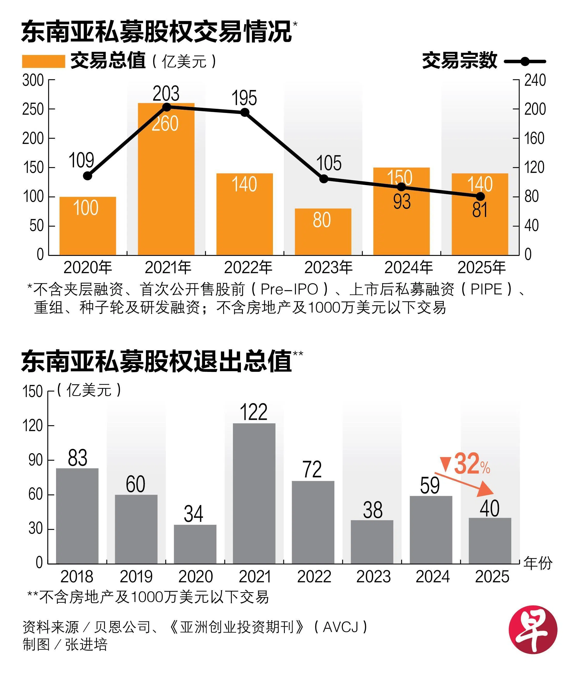 东南亚私募股权市场退出困境愈发严峻,2025年市场退出(exit)总值同比下滑32%至约40亿美元(约51亿元),退出交易宗数也减少近四成。