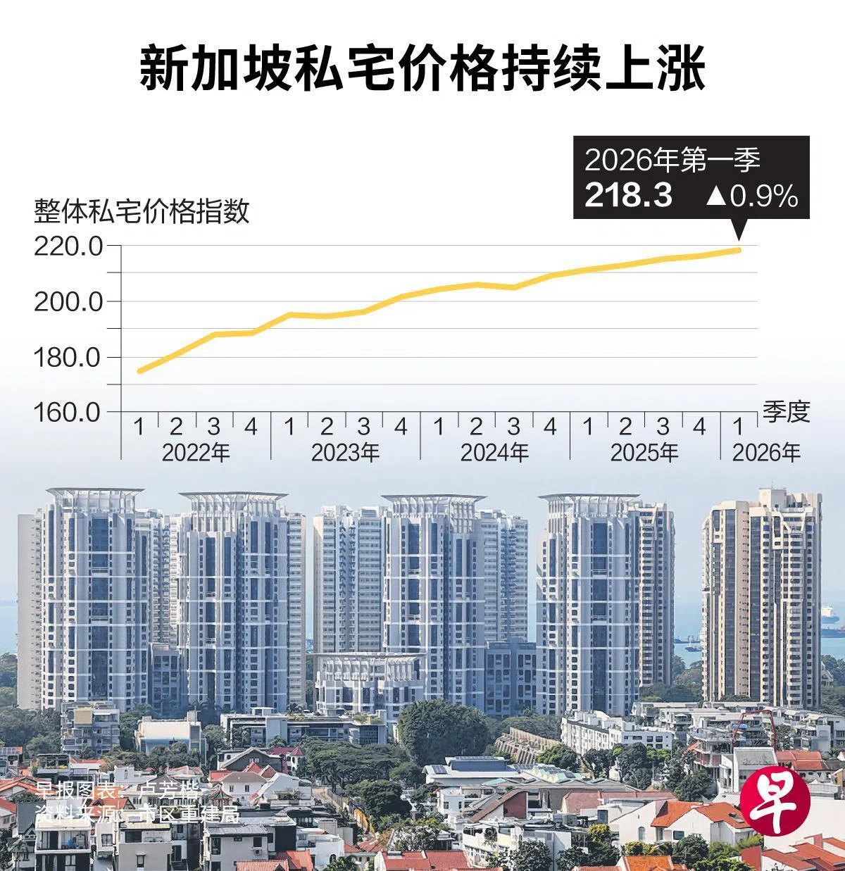 新加坡整体私宅价格再次上涨,今年第一季私宅价格环比上升0.9%,租金稍微上升0.3%。