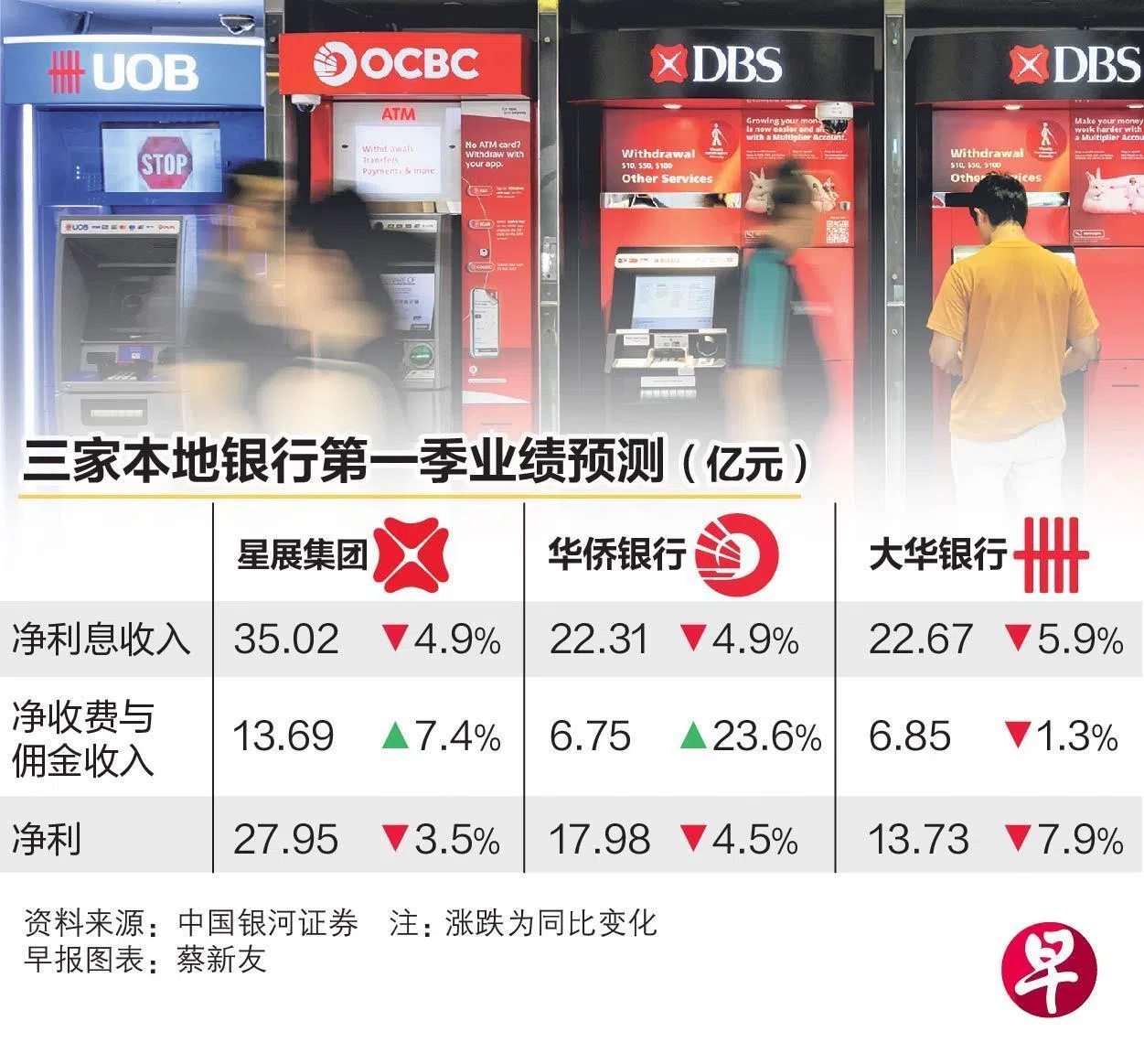 中国银河国际证券分析师郑伟权对三家银行首季表现较谨慎看法,预计净利同比呈下跌走势,跌幅介于3.5%至7.9%。其中,大华银行同比净利可能跌最多。