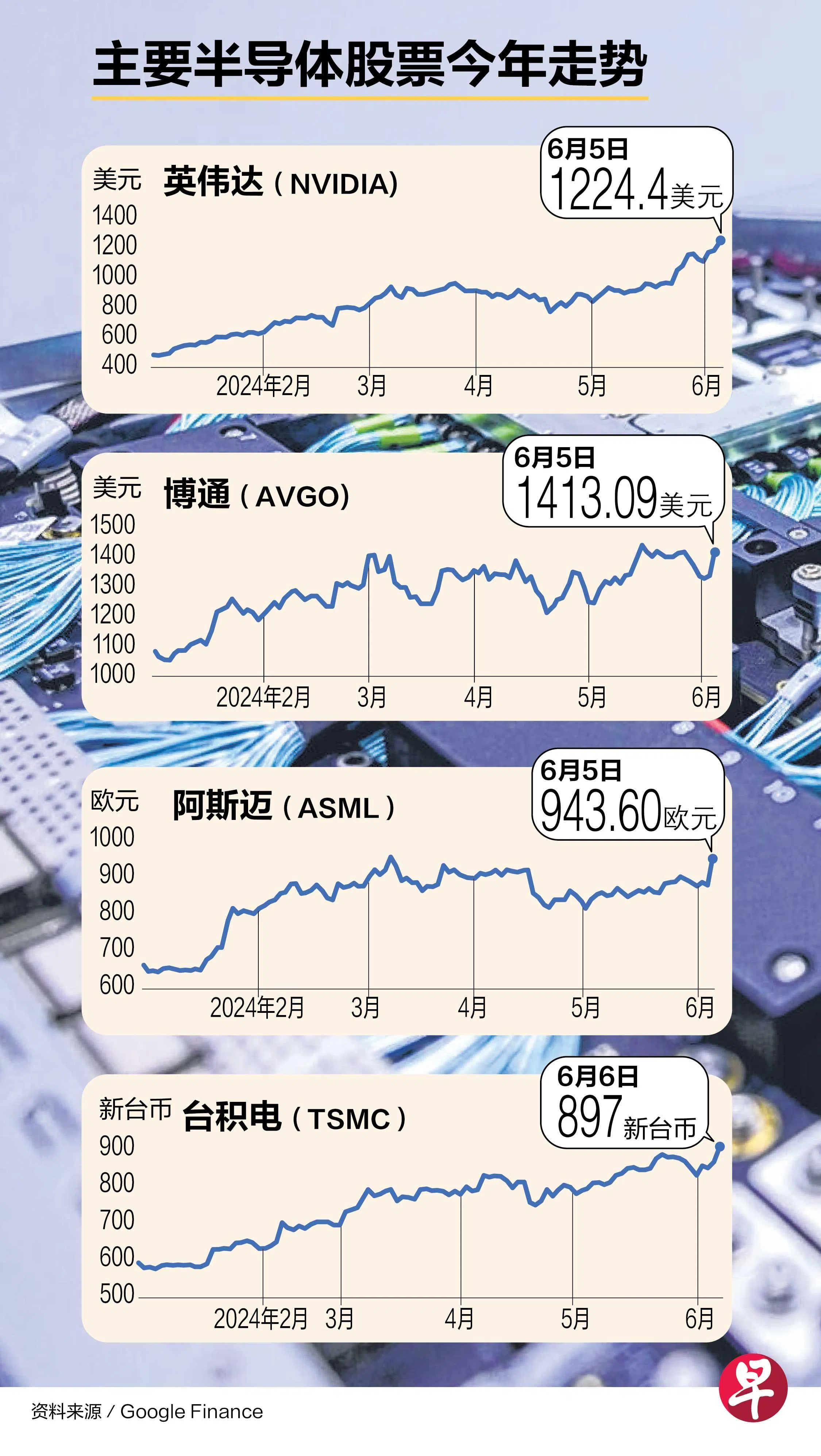 在强劲需求推动下,美国晶片生产商英伟达(Nvidia)股价再创新高,星期三(6月5日)攀升至1224.40美元,成为第一家市值超过3万亿美元(4万零372亿新元)的晶片生产商。