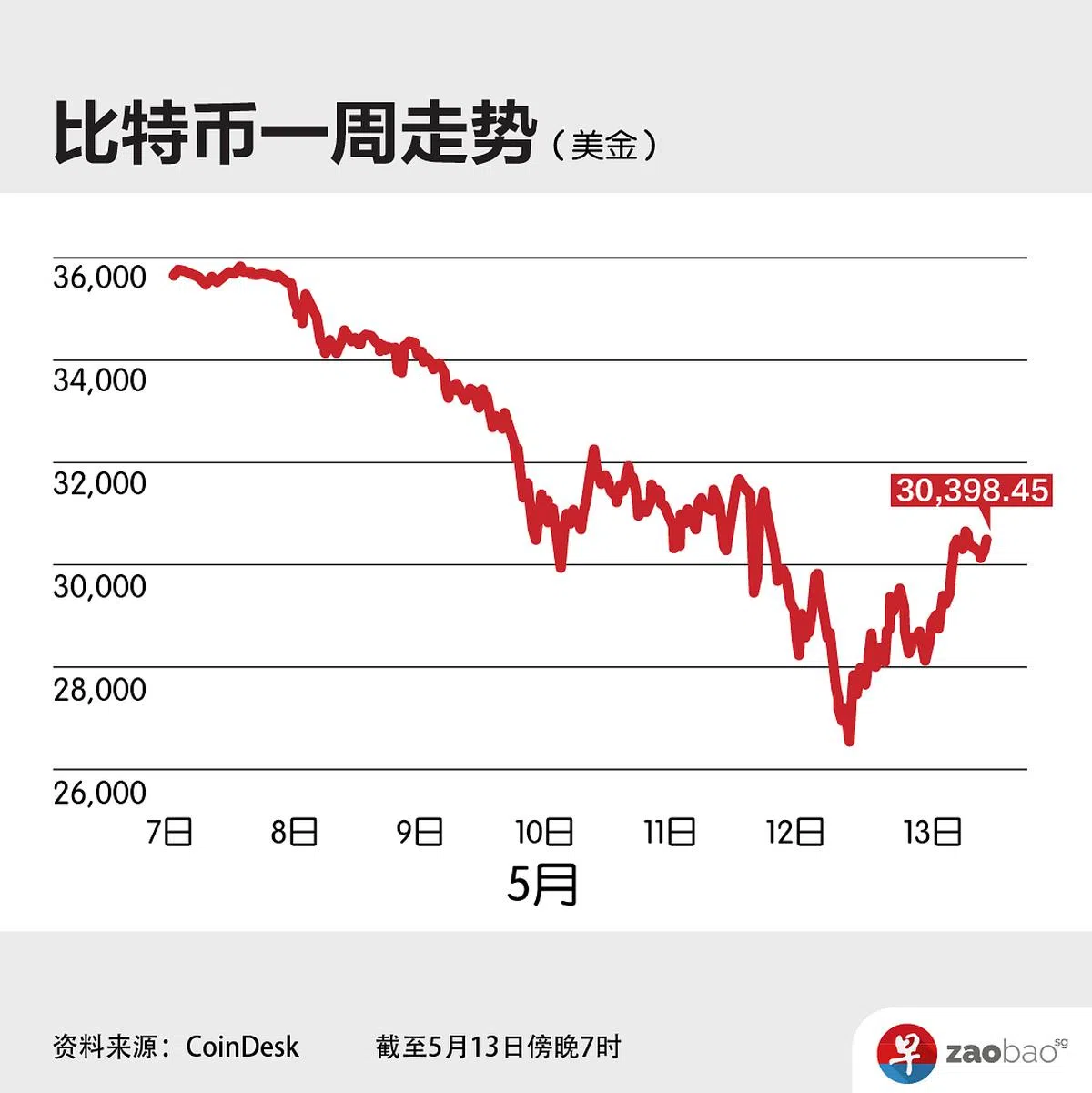 其他加密货币也难逃波折,比特币本周几度跌破3万美元心理关口,周四(5月12日)更是一度暴跌至2万6639美元,是2020年12月以来的最低价位。