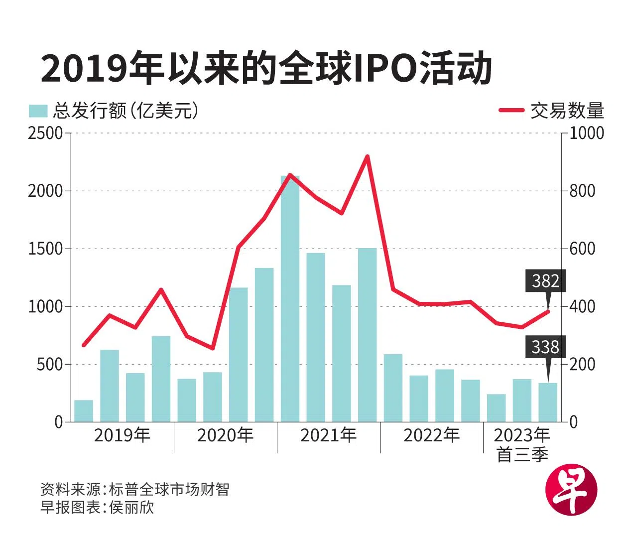 今年第三季IPO共发售了总额338亿美元(约464亿新元)的股票,2022年同期为455亿2000万美元,两年前为1184亿2000万美元。